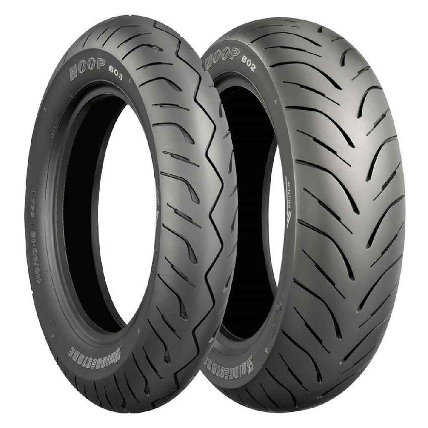 Motopneu Bridgestone BRIDGESTONE HOOP B 02/03 je motopneu pro moderní, výkonné skútry. Poskytuje vynikající vlastnosti v zatáčkách a to i na mokré vozovce. BRIDGESTONE HOOP B 02/03 je užíván jako prvomontáž u Hondy Silver Wing, Suzuki Burgman či na Yamaze XP 500. Jsou navrženy tak, aby dokázaly čelit výzvám jízdy po městě na různém povrchu, za mokra i za sucha. Modely Hoop B02 a B03 se hodí pro montáž na širokou řadu strojů od 50 do 400 ccm. Zakuste pohodlí vysoce kvalitní diagonální konstrukce, která umožňuje výbornou charakteristiku ovladatelnosti a vysoký kilometrový nájezd. Snížený hluk vzorku předních a zadních pneumatik zajišťuje vskutku efektivní a především pohodlnou jízdu na různých površích.
